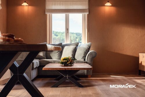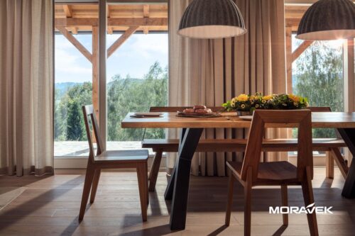 Naše firma zajistila výrobu a pokládku masivních dubových podlah a obklad schodiště. Dále jsme přispěli výrobou záklopu stropu a dodávkou nábytku pod naší značkou MOW – jídelního stolu Comte, lavice Charis a židlí. Povrch nábytku je ručně hoblovaný v designu MOW Craft Design, což z každého kusu činí jedinečný originál. Více informací najdete na www.moworiginal.cz.